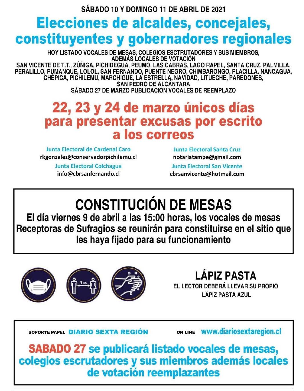 ¿quiénes serán vocales de mesa? Por lo anterior, no se enviará carta certificada informando de la. El 27 de marzo el servel reveló la nómina definitiva de las personas que deben cumplir con el rol de vocales de mesa en los próximos comicios que elegirán alcaldes, concejales, gobernadores regionales (intendentes) y constituyentes. Valparaíso, aysén y magallenes son las regiones que ya determinaron quiénes serán sus gobernadores, quienes fueron elegidos con un 43,7%, 48,7% y 42,1% respectivamente. Para esta segunda vuelta de gobernadores, serán vocales de mesa las mismas personas que participaron del proceso el 15 y 16 de mayo, exceptuando obviamente a los vocales de las regiones de valparaíso, aysén y magallanes.